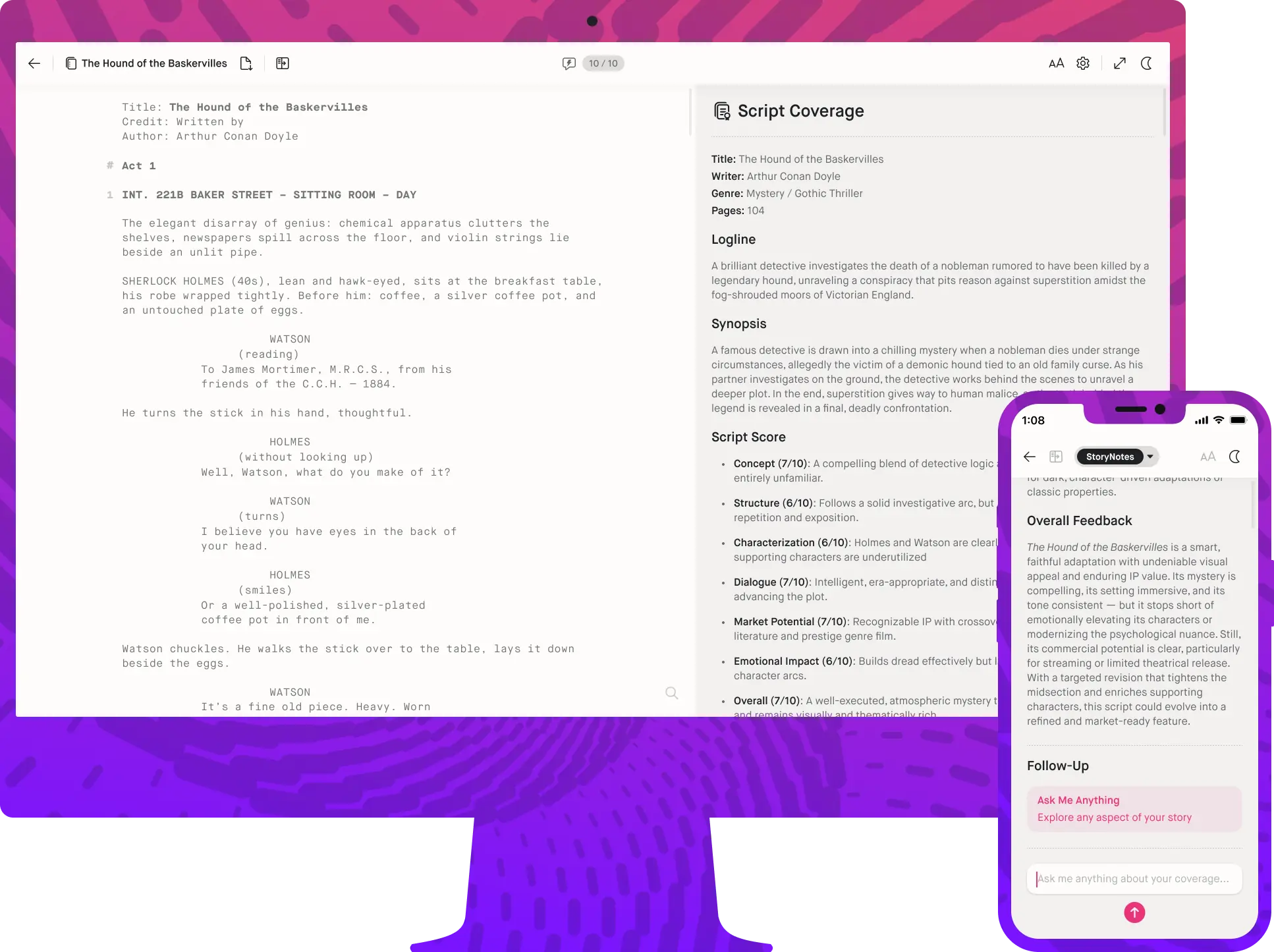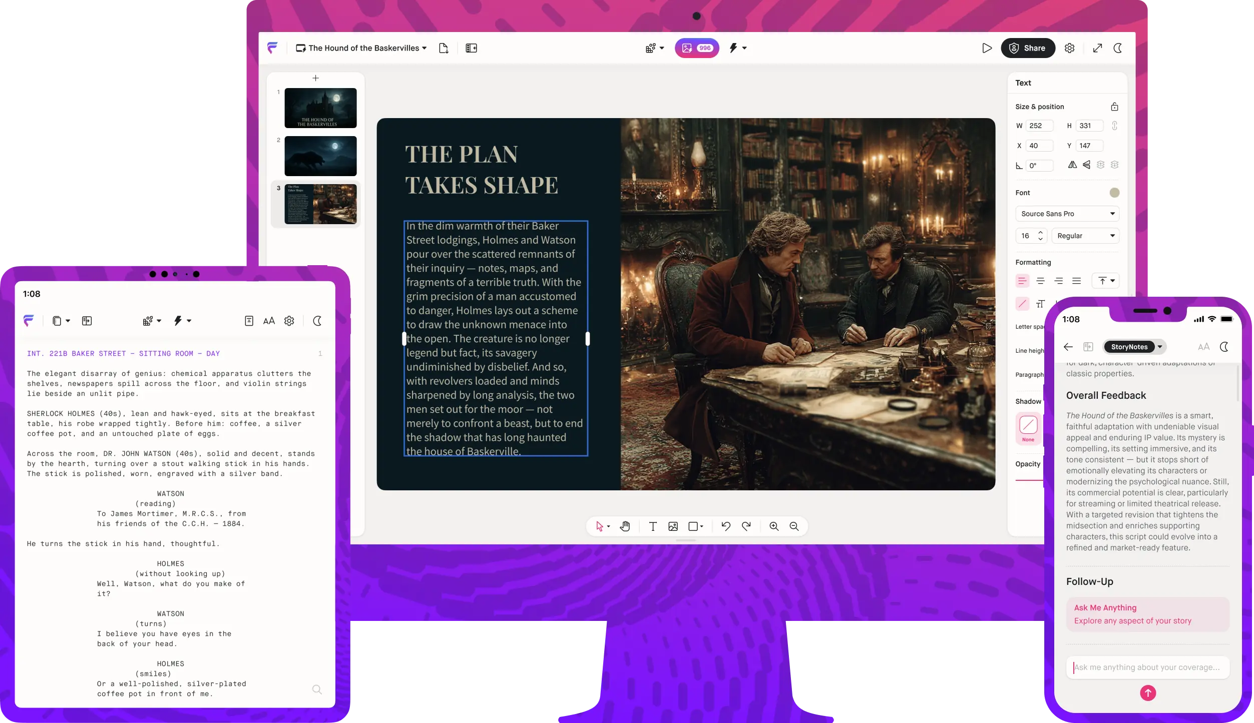 Forme helps you develop your entire story — unlimited drafts, instant analysis, painless pitch decks — all in one place.